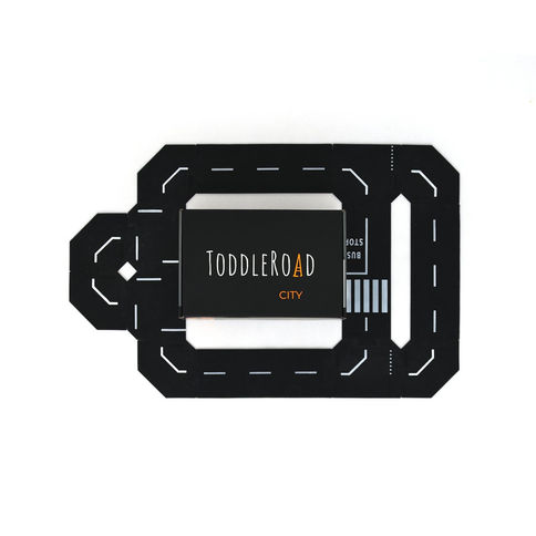 Ciudad es la versión compacta de ToddleRoad: un conjunto de piezas de silicona flexible que permite crear recorridos urbanos de manera sencilla, estable y completamente abierta al juego de la infancia. Su diseño amplio, negro mate con líneas blancas sutiles, acompaña la creación de circuitos sin imponer una forma fija, dejando espacio para imaginar trayectos propios.